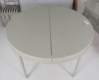 6 stolar av "Lindome-modell". Bord, diam 109(219), h 75. Skåp, l 128, b 47, h 175. Skänk, l 170, b 43, h 74.