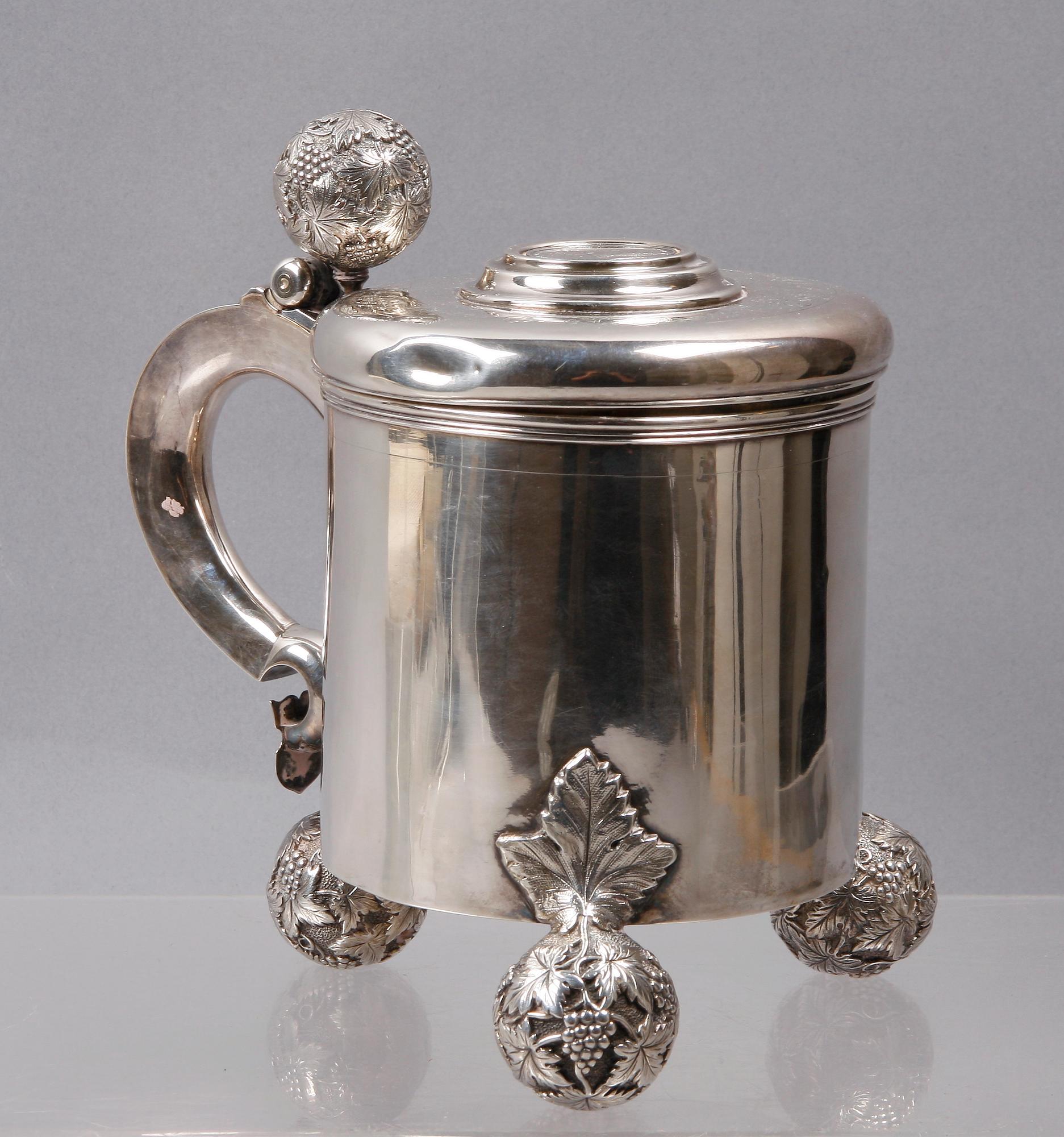 Cylinderform, svängt handtag med kulknopp. Tre kulfötter med dekor av vinlöv och druvklasar. Locket med infälld kröningsmedalj för Konung Karl XV. H 19.