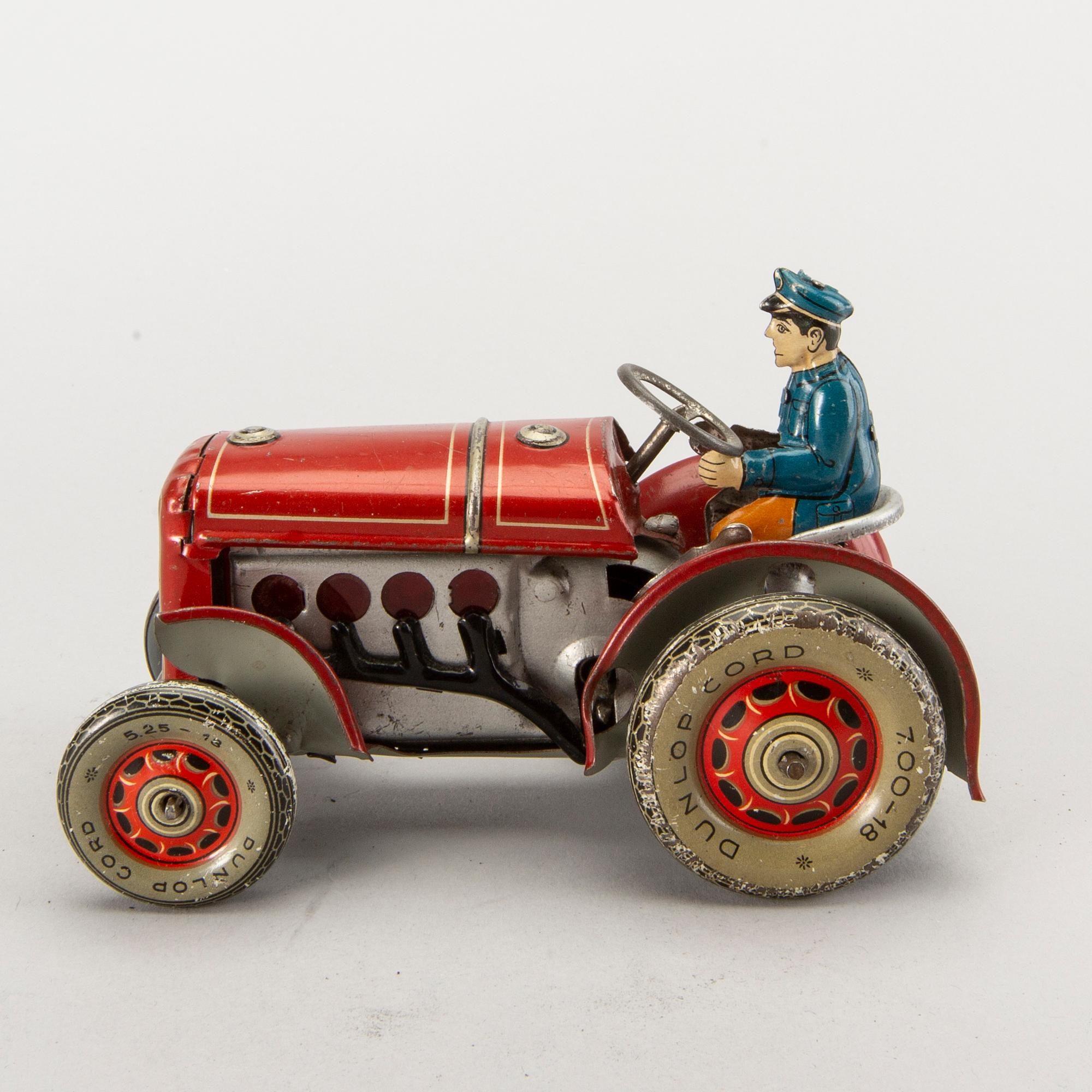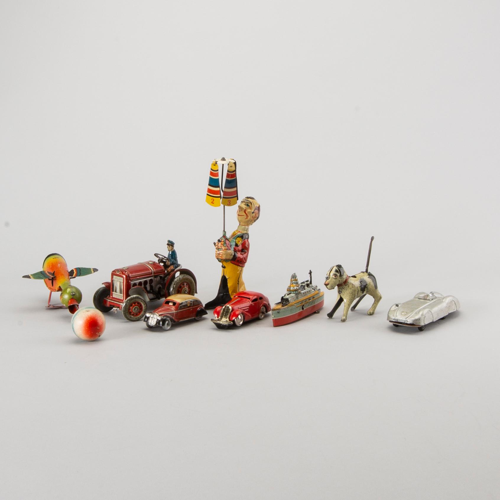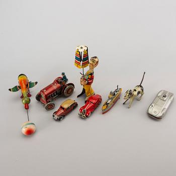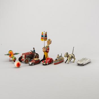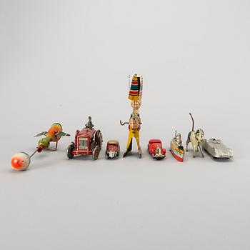 Diverse plåtleksaker i litograferad plåt. Höjd ca 6-20 cm.