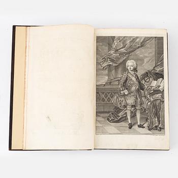 Jöran A. Nordberg: Leben Carl des Zwölften Königs in Schweden mit Münzen und Küpfern. 1-3. Hamburg 1745-52. Folio. 39,5 x 25 cm. [16] + 118 + [6] + 123-578 + [4] + 585-704; + XVI + 768; + [10] + XX + 882 sid. + 3 graverade titelblad + 5 graverade porträtt + 24 graverade planscher / bataljplaner, varav 13 utvikbara. Texten rikt illustrerad med c. 300 graverade vinjetter och mynt- & medaljavbildningar. Bunden utan förtitelbladen.