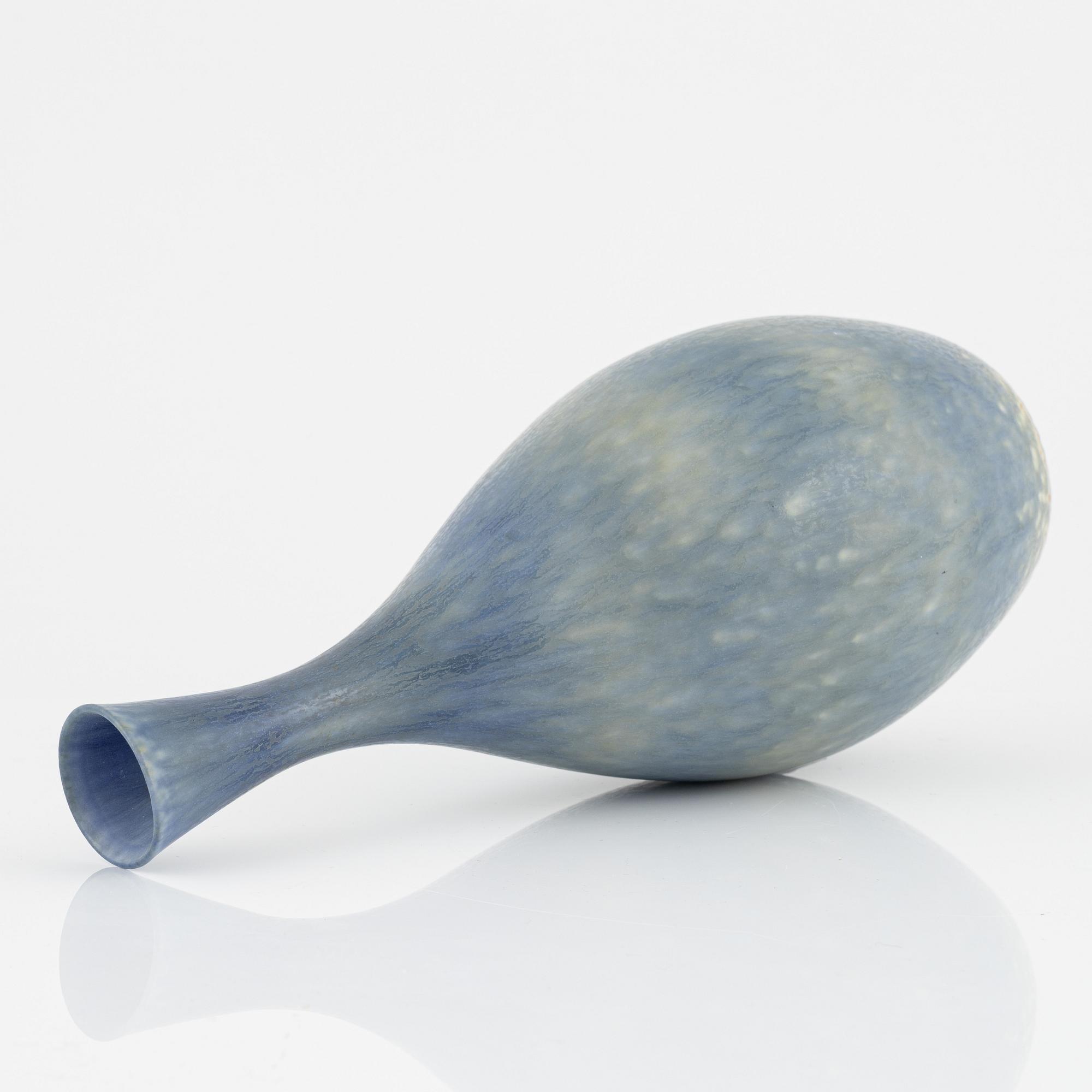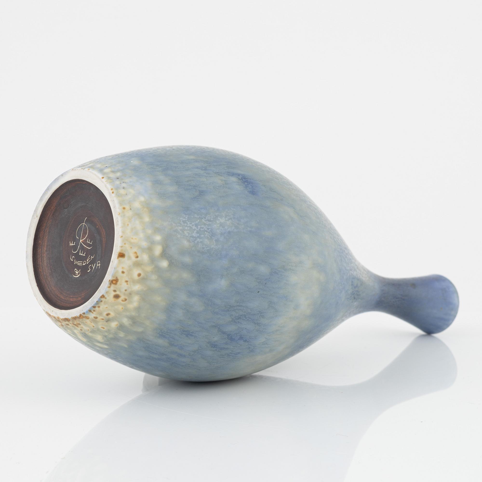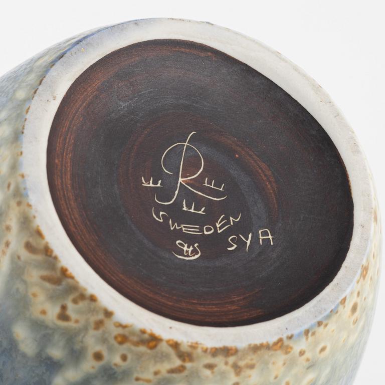 Kägelformad med indragen hals, spräcklig glasyr i gråblå nyanser. Signerad R Sweden CHS SYA. Höjd 29 cm.