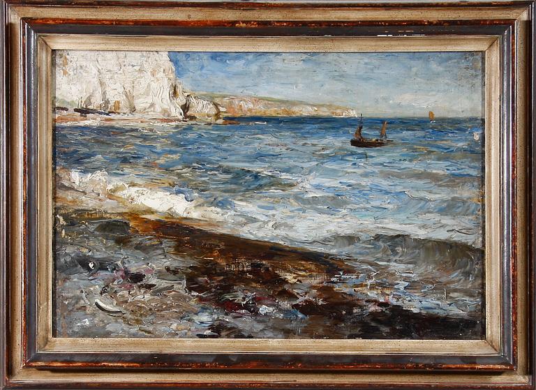 Kustmotiv med fartyg och Dovers vita klippor. 36 x 53.