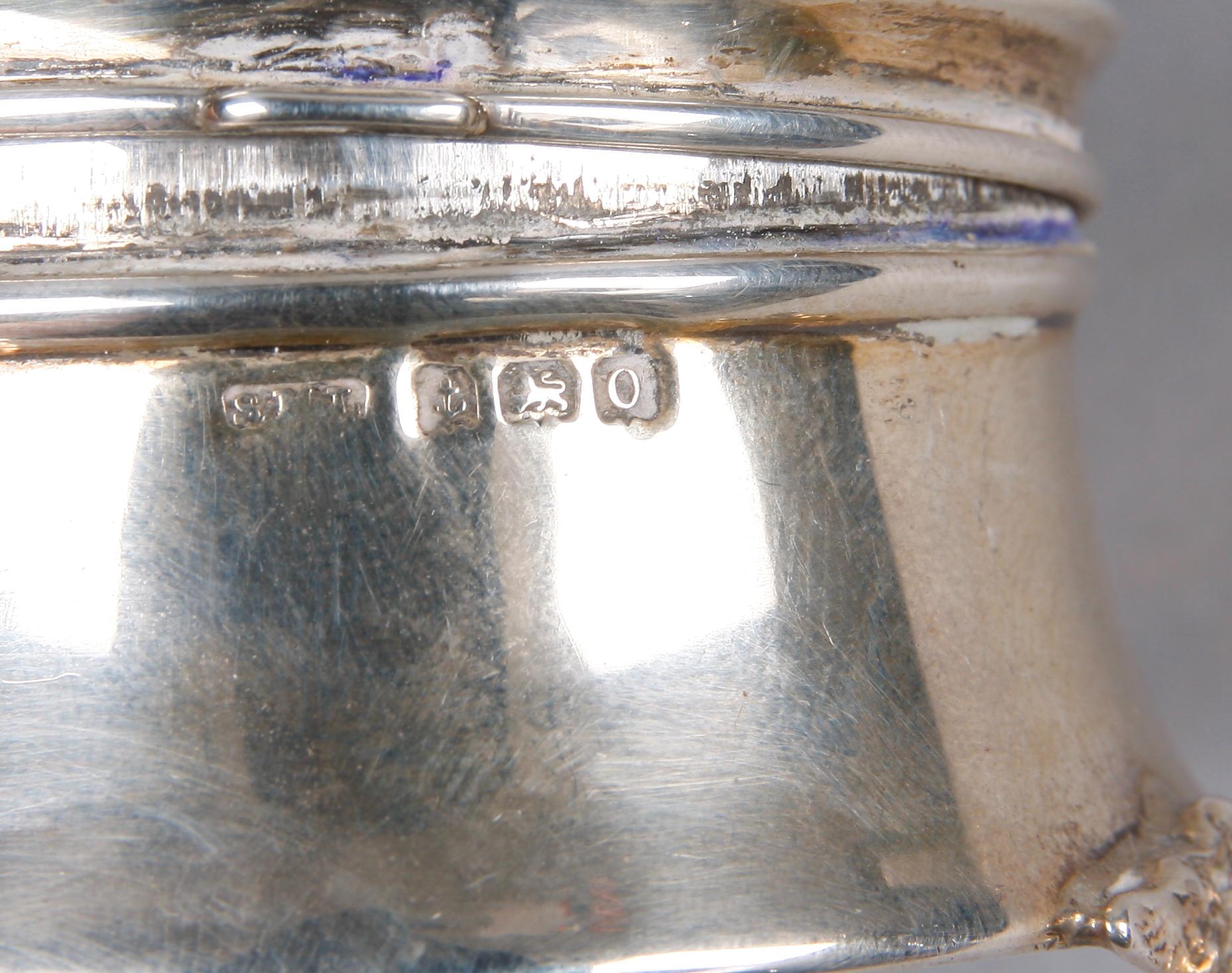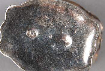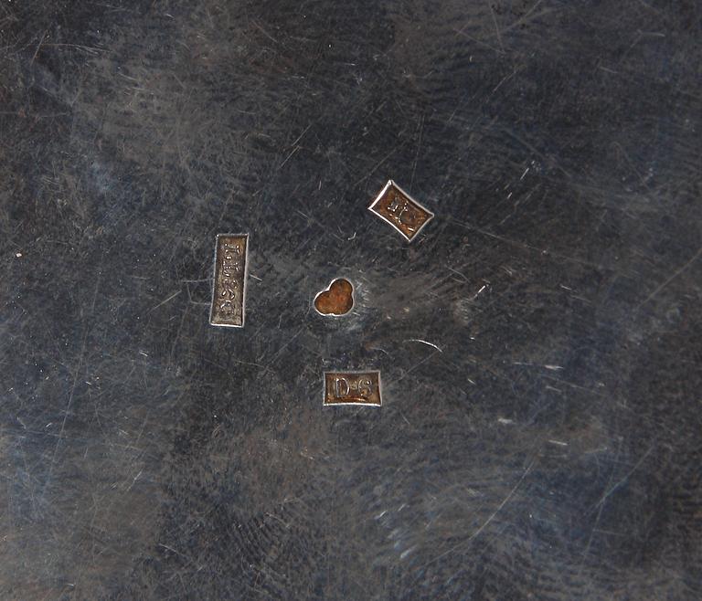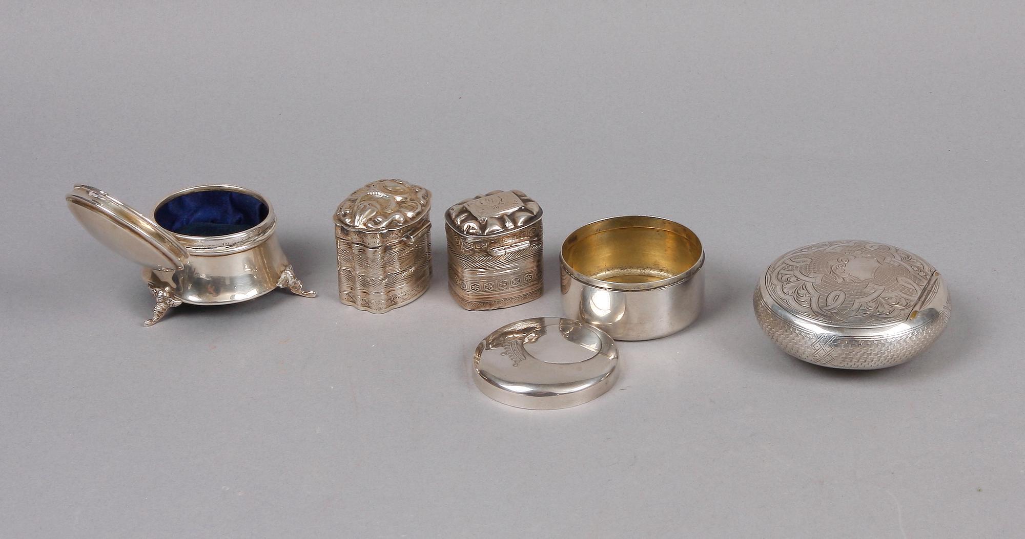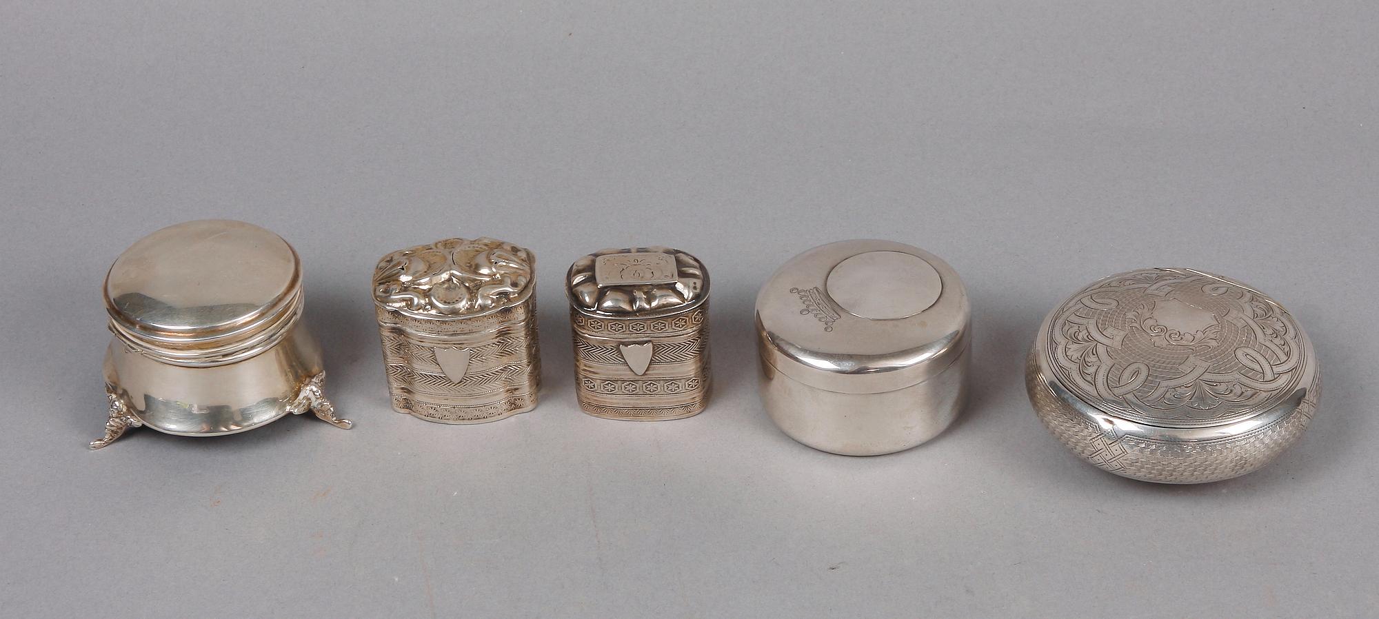 Två olika holländska dosor av luktdosetyp, 1859 resp 1864. Smyckedosa på tre tassfötter, Birmingham 1913. Rund dosa med rik dekor i nyrenässans, Wien ca 1880. Toilettdosa med graverad friherrlig rangkrona, L. Larsson, Göteborg 1882. H 3-4.