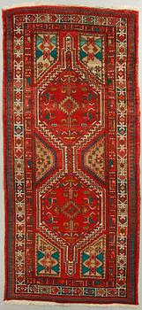 Stiliserat mösnster i grönt, orange och benvitt mot mörkröd botten.
