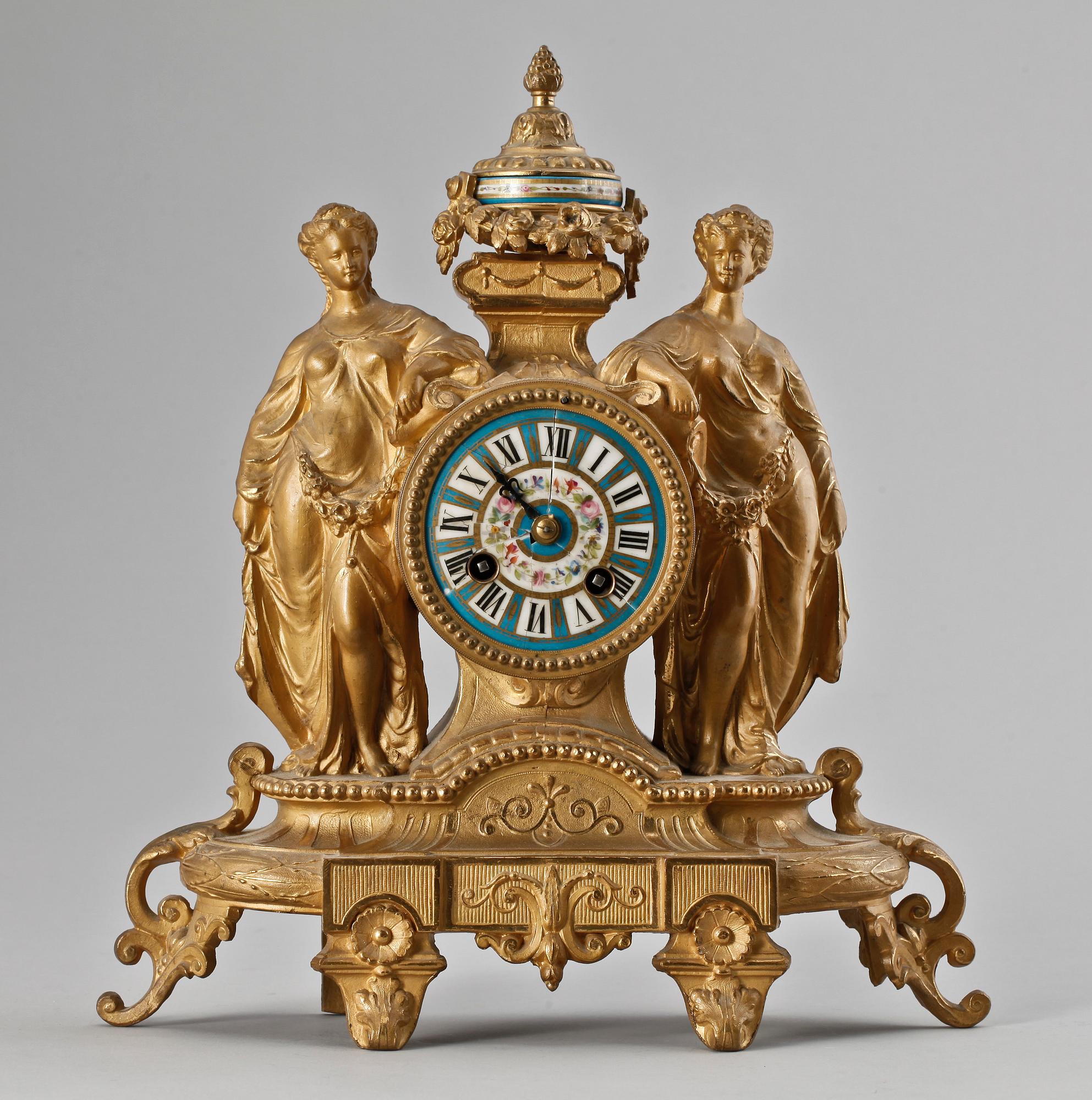 Gjuten. Kvinnor på konsol, krön av emaljerad urna. Blomsterdekor samt akantusblad. Elektrolysförgyllning. Urtavla av emalj. Märkt ITM. H 32.