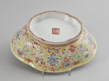 Blomsterdekor i rosa, gult och blått. Oval form. Träsockel medföljer. L 21.
