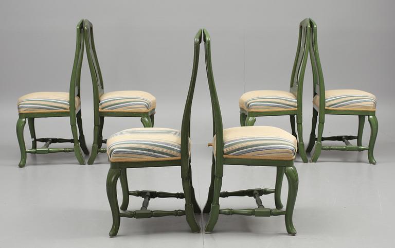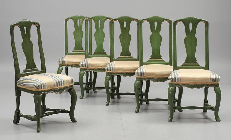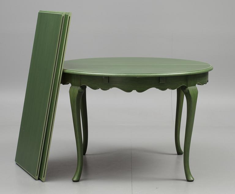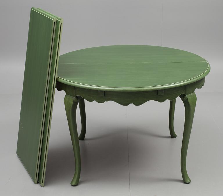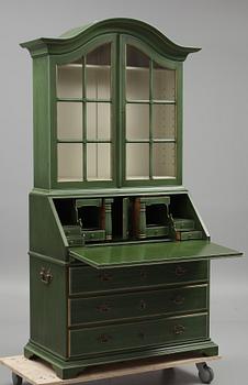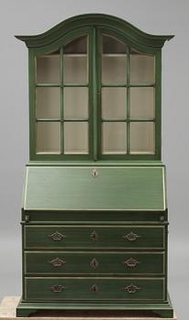 Grön dekorationsmålning. 6 stolar. Bord med 2 iläggsskivor. Diam 115(215), h 75. Skrivskåp tvådelat, lådor undertill, överdel med vitrindörrar, snedklaff med bakomliggande skrivinredning. L 103, b 53, h 200.