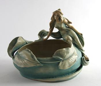 Reliefdekor av blad och blomma samt sittande kvinna. Märkt T Schools och i botten D p BB 75 78. H 22.