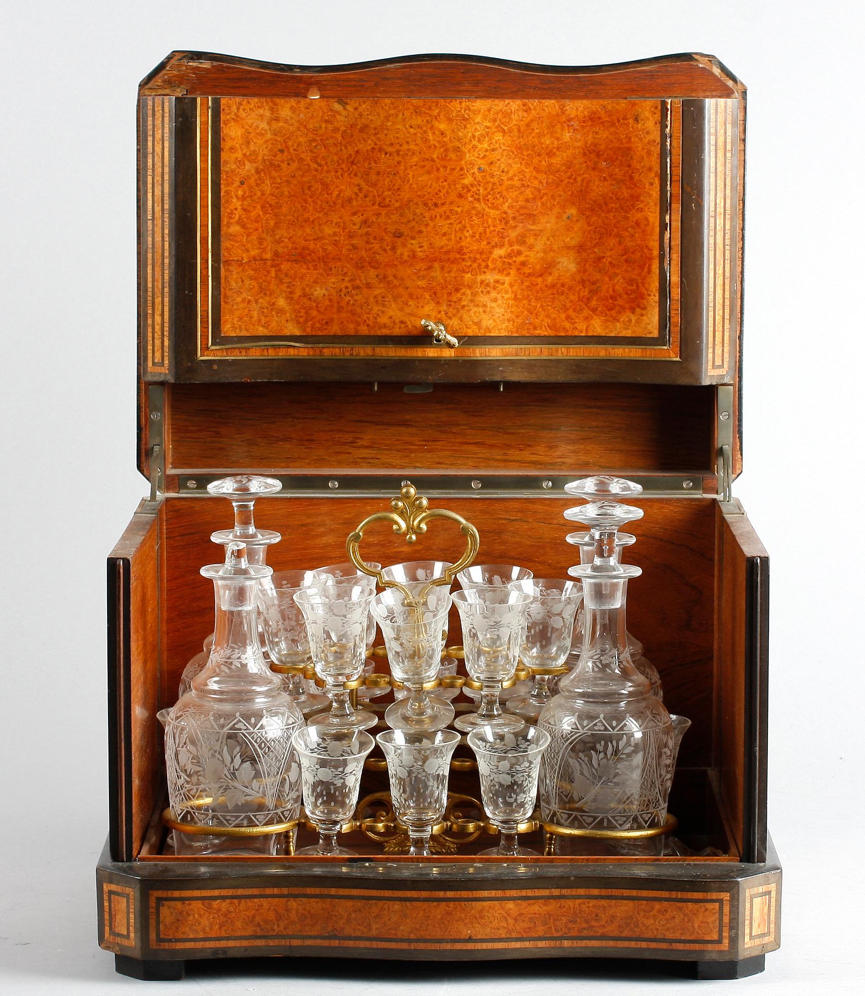 Schatull fanerat med bl a alrot, med intarsiadekor och infällda mässingslister. Uppfällbart lock, utfällbara sidor. Inredning med 4 flaskor med propp, 16 snapsglas, etsad dekor. Schatullets l 36, b 27, h 27. Nyckel finns.