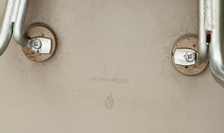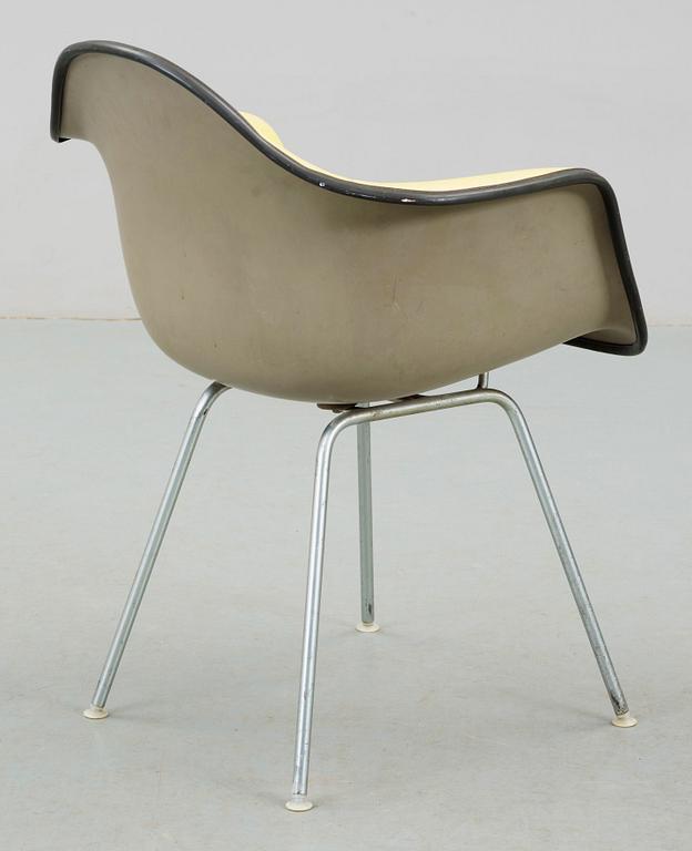Glasfiberskal, klätt i gul konstläder. Kromade stålrörsben.