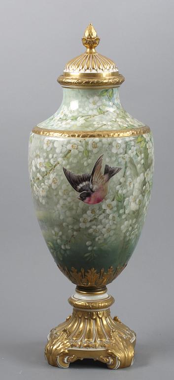 Balusterformad på bladhölstrad fot. Välvt lock med knopp. Polykrom bemålning och guld. Heltäckande dekor av vita körsbärsblommor och domherre i flykt. H 74.