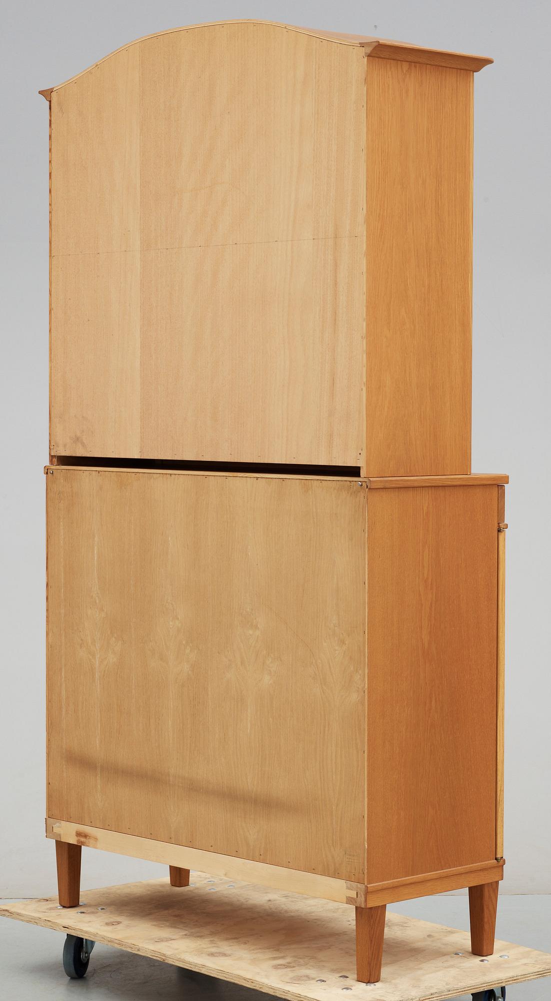 Skåp med uppsvängtkrön med parställda dörrar med bakomliggande hyllor. Underdel med två lådor. Under parställda dörrar med bakomliggande hyllor. L105, B 38,5, H 186. Nyckel finns.
