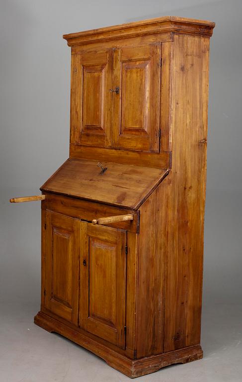 Två dörrpar, på insidan hyllplan, snedställd skiva med fackinredning. L 111, b 54 (+31 klaff) h 201. Nyckel finns.