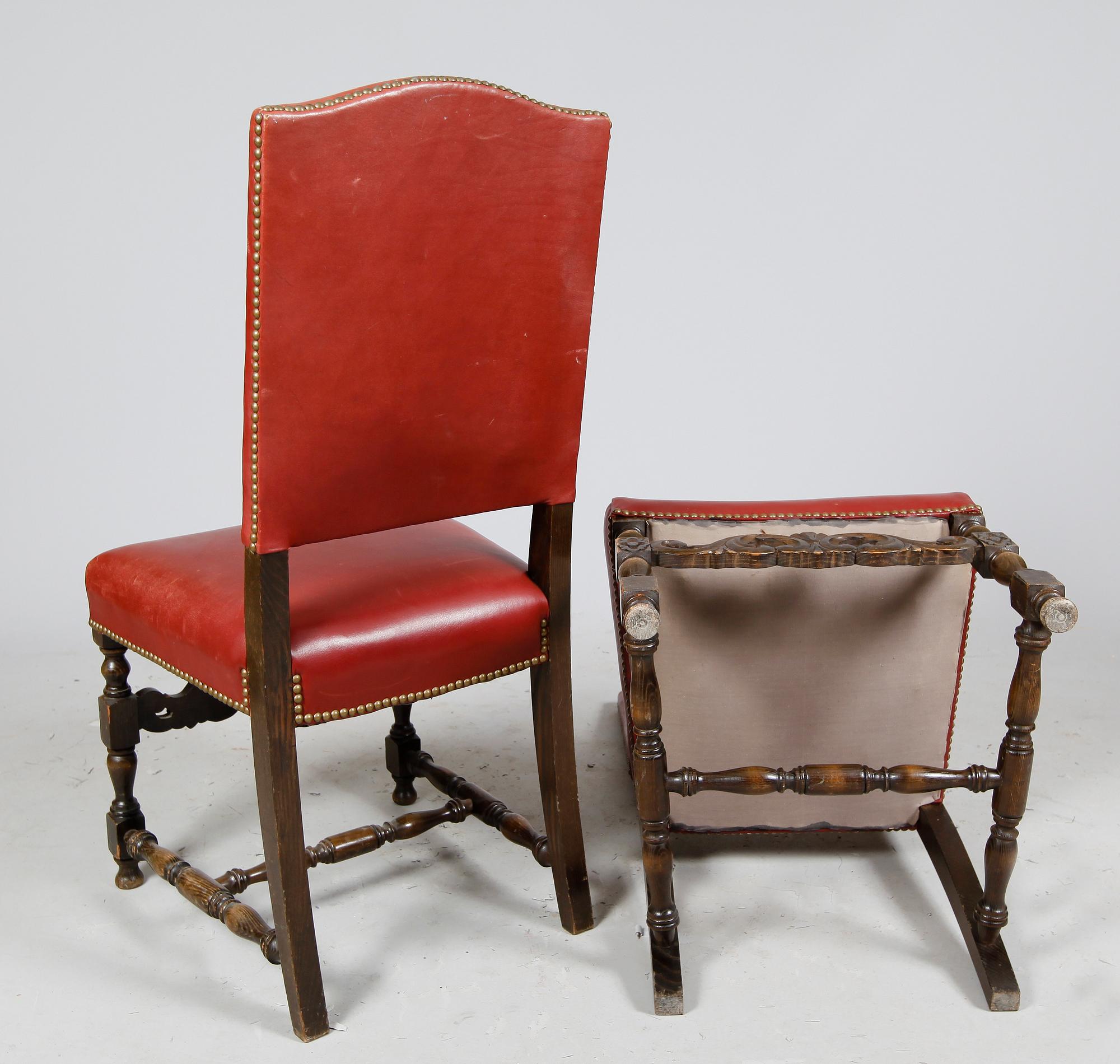 Fast stoppad rygg och sits. Klädsel av rött skinn.