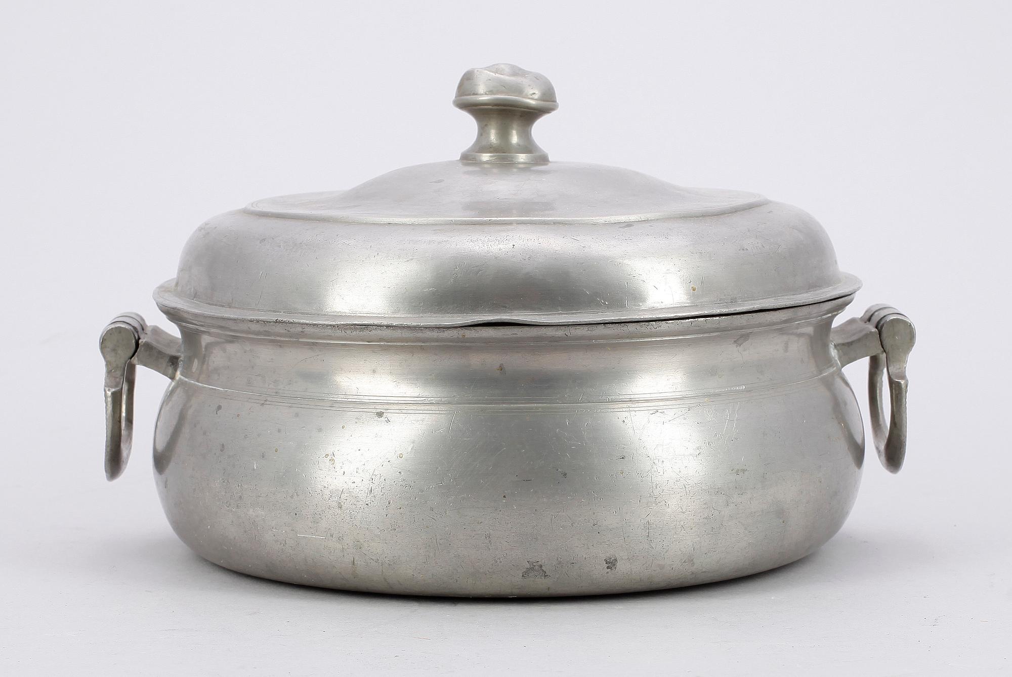 Rund form. Med två hänklar och krönande knopp. Pärlstavsdekor.
