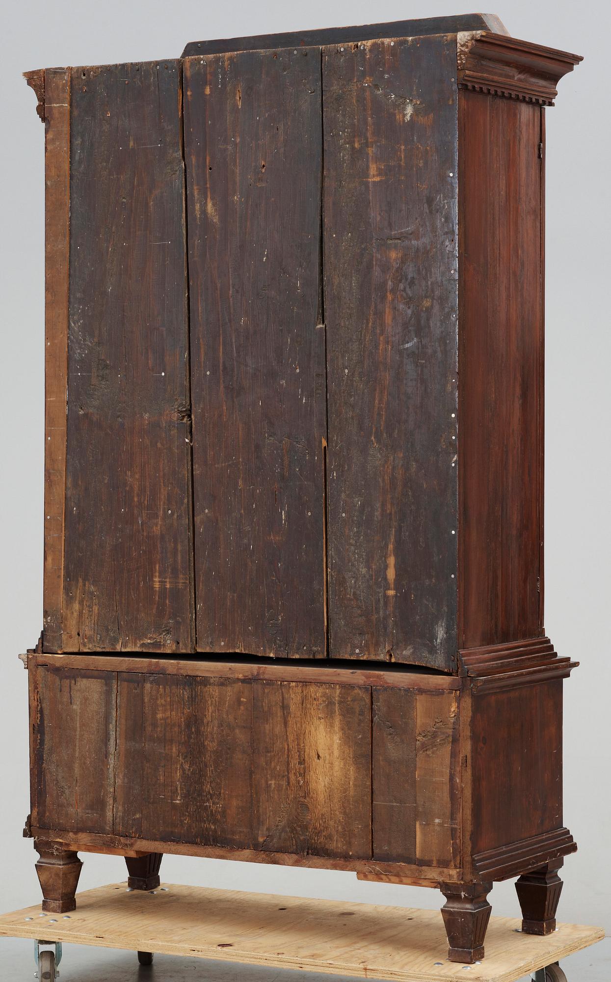 Brunbetsat trä. Underdel med 3 lådor. Överdel med dörrpar och hyllinredning. Beslag i mässing. Kannelerade ben. Brutet krön. l 113, b 44, H 193. Nyckel finns.