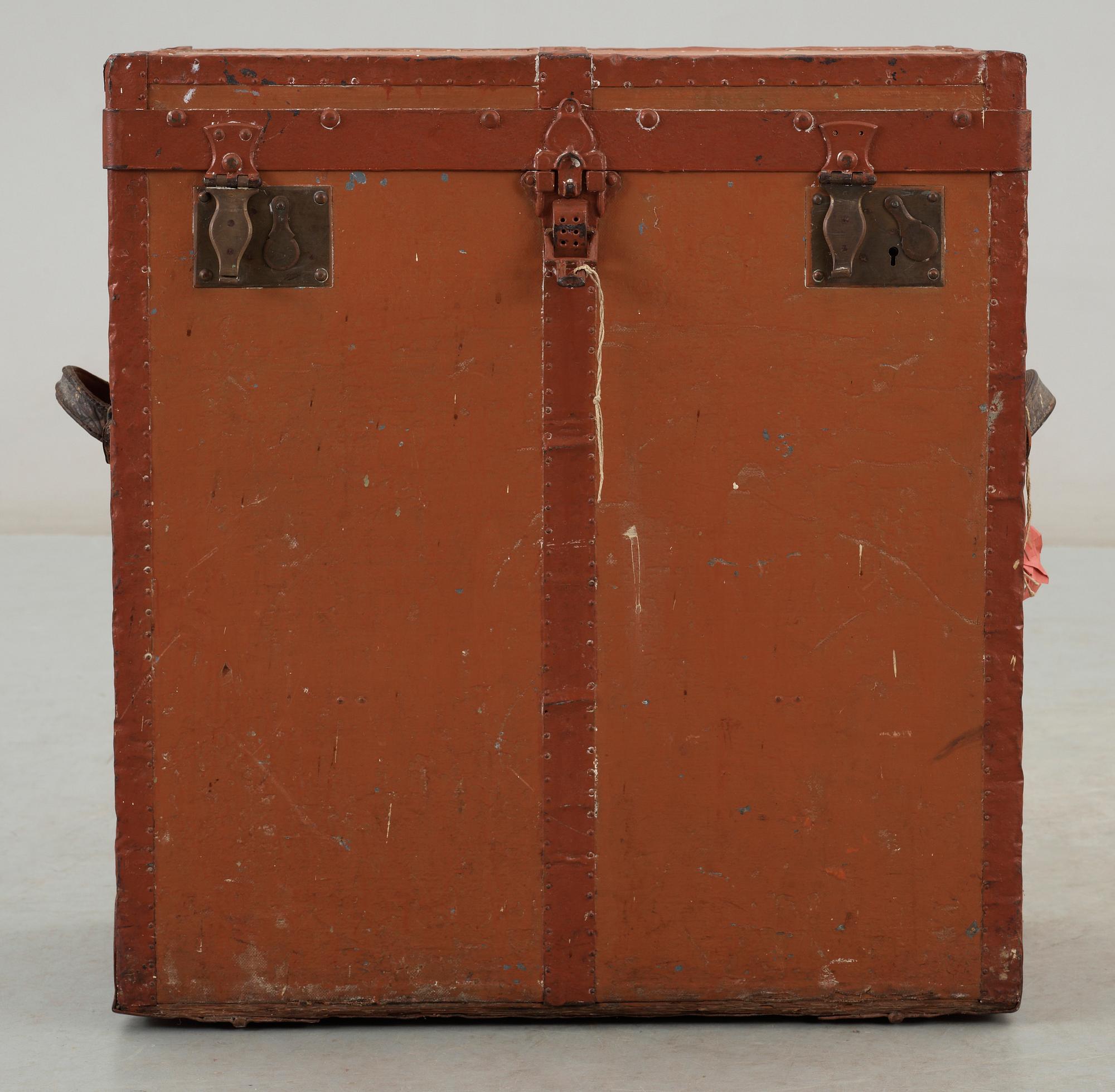 Bemålad i rostrött och orange. med metallbeslag. Insida klädd i röd- och vitrandig textil, med spännremmar i naturfärgat läder. Bär rester av etiketter. L 65 B 35 H 70.