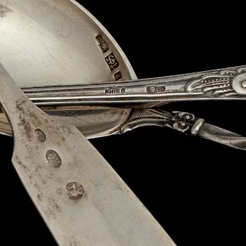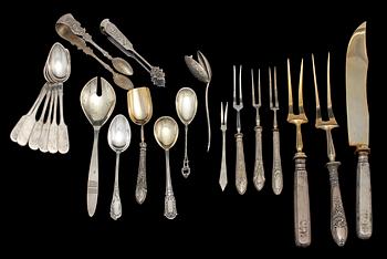 2 sockertänger, 3 trancherbestick med blad i stål, 4 gafflar varav tre med delar av stål, 3 uppläggningsskedar varav en med delar av stål, 8 teskedar, tekula.