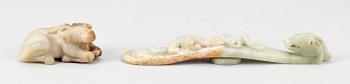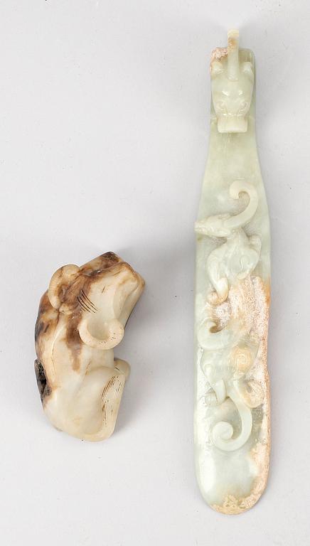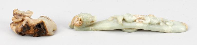 Lyckodjur i form av vattenbuffel. Bältesspänne med djurdekor. Längd 9 resp 23 cm.