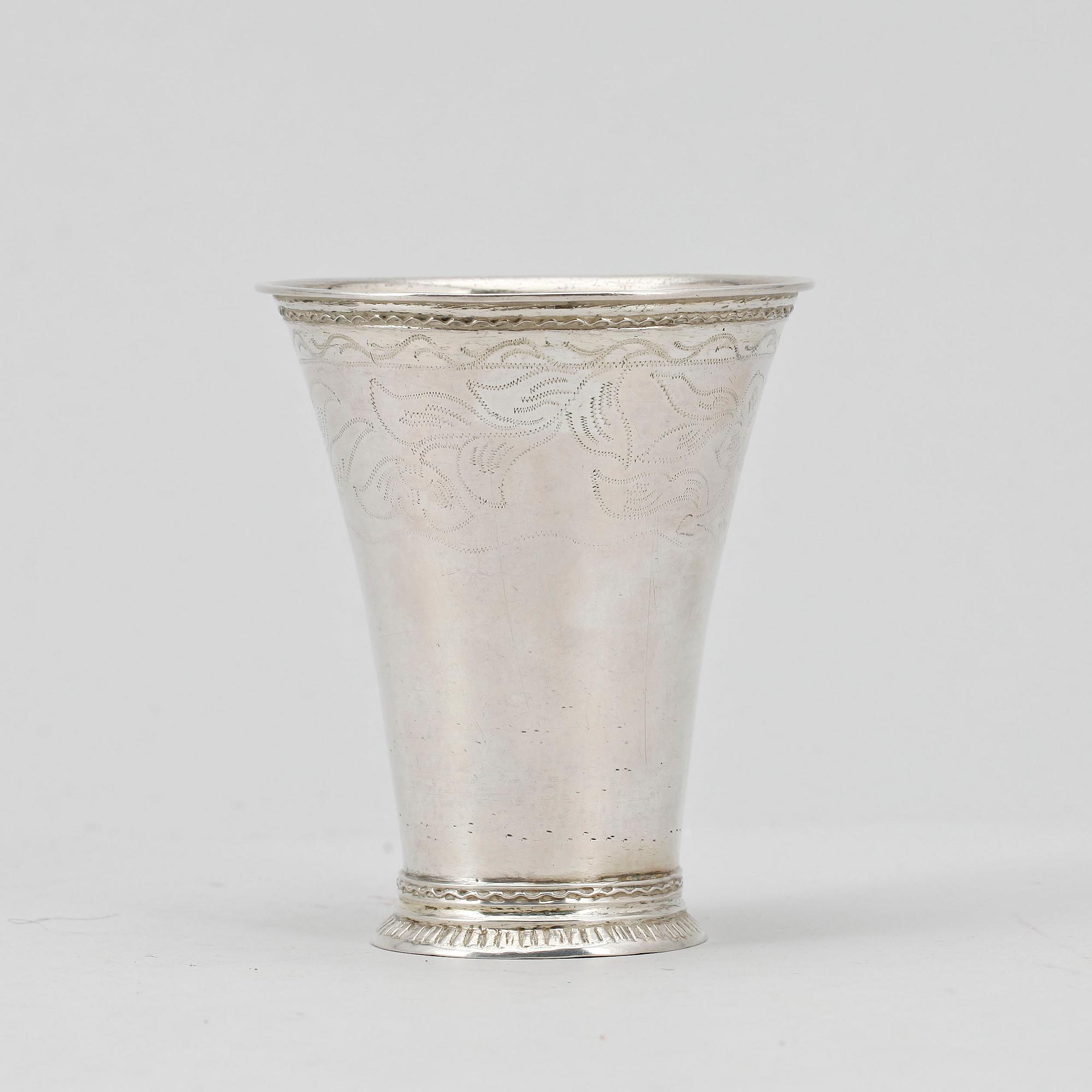 Trumpetformad, godronnerad fotring. Invändigt förgylld. Svisselerad floral dekor. H 10.