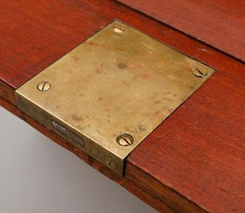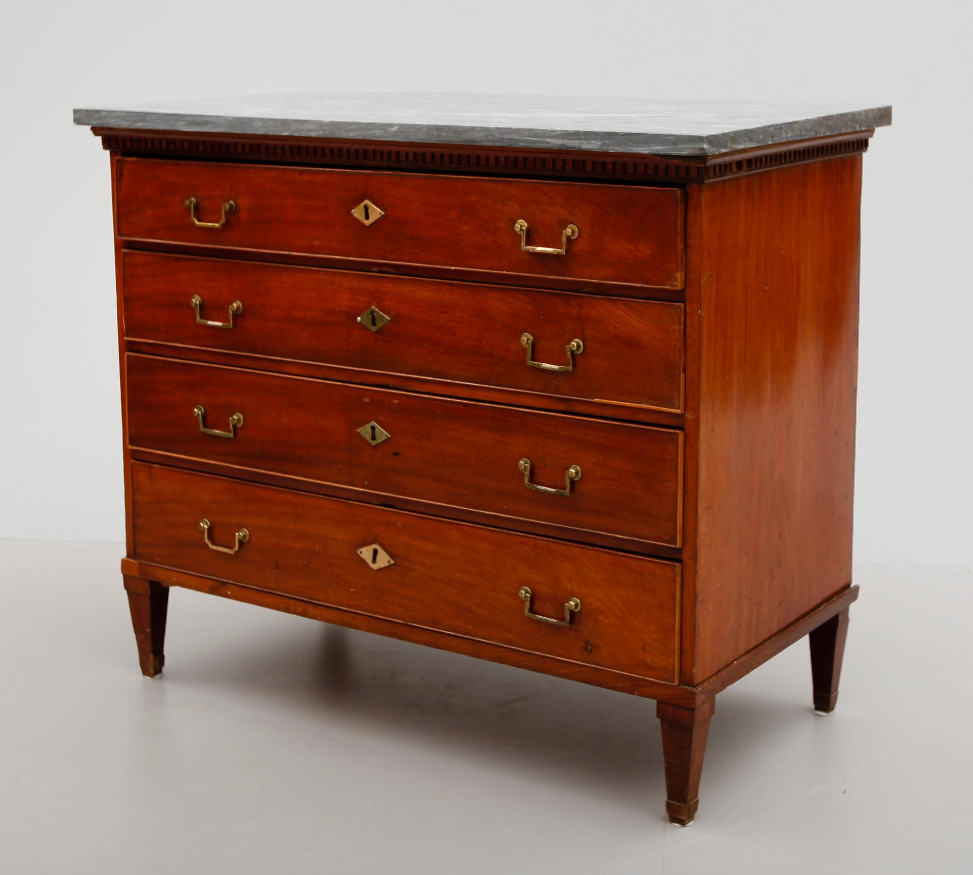 Fanerad med mahogny. Övre låda med skrivinrikt. 3 lådor under. Beslag av mässing. Skiva av marmor. Bredd 101. Djup 51. Höjd 87 cm.