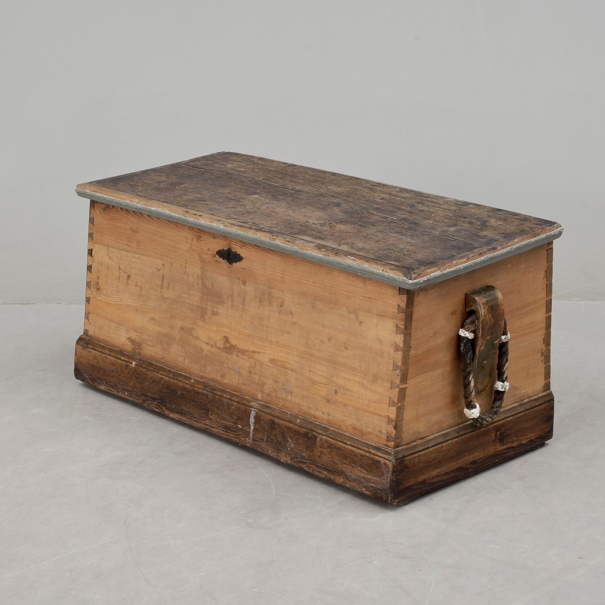 Sidor med rephandtag. Bemålad insida, lock med dekor. Insida med fack. Längd ca 94, bredd ca 45, höjd ca 44 cm.