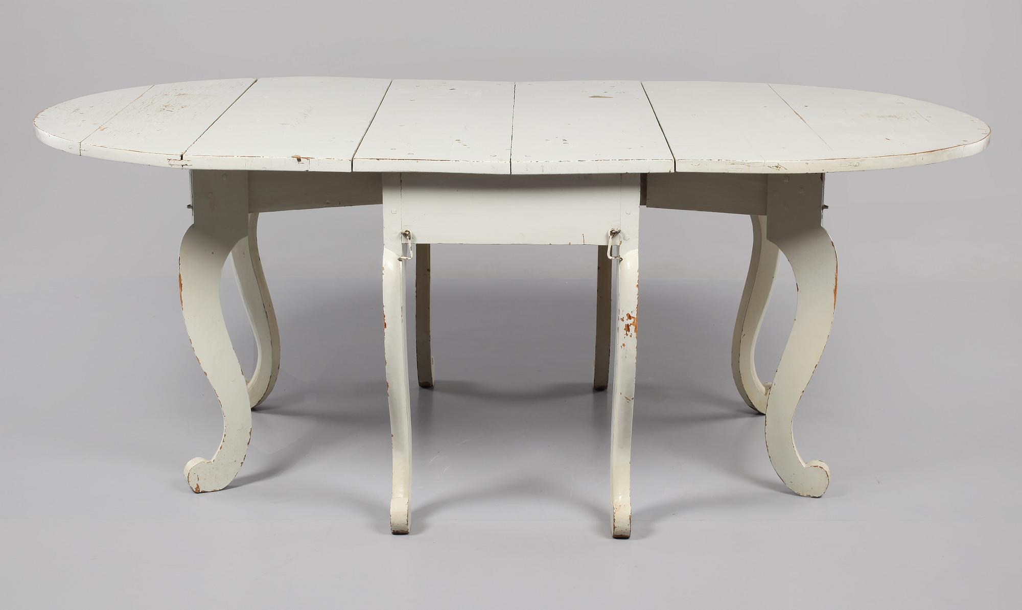 Gråmålat. Med uppfällbara klaffar. Svängda profilerade ben. Längd ihopfällt 61, bredd 108, höjd 77 cm. Total längd uppfällt 206 cm.