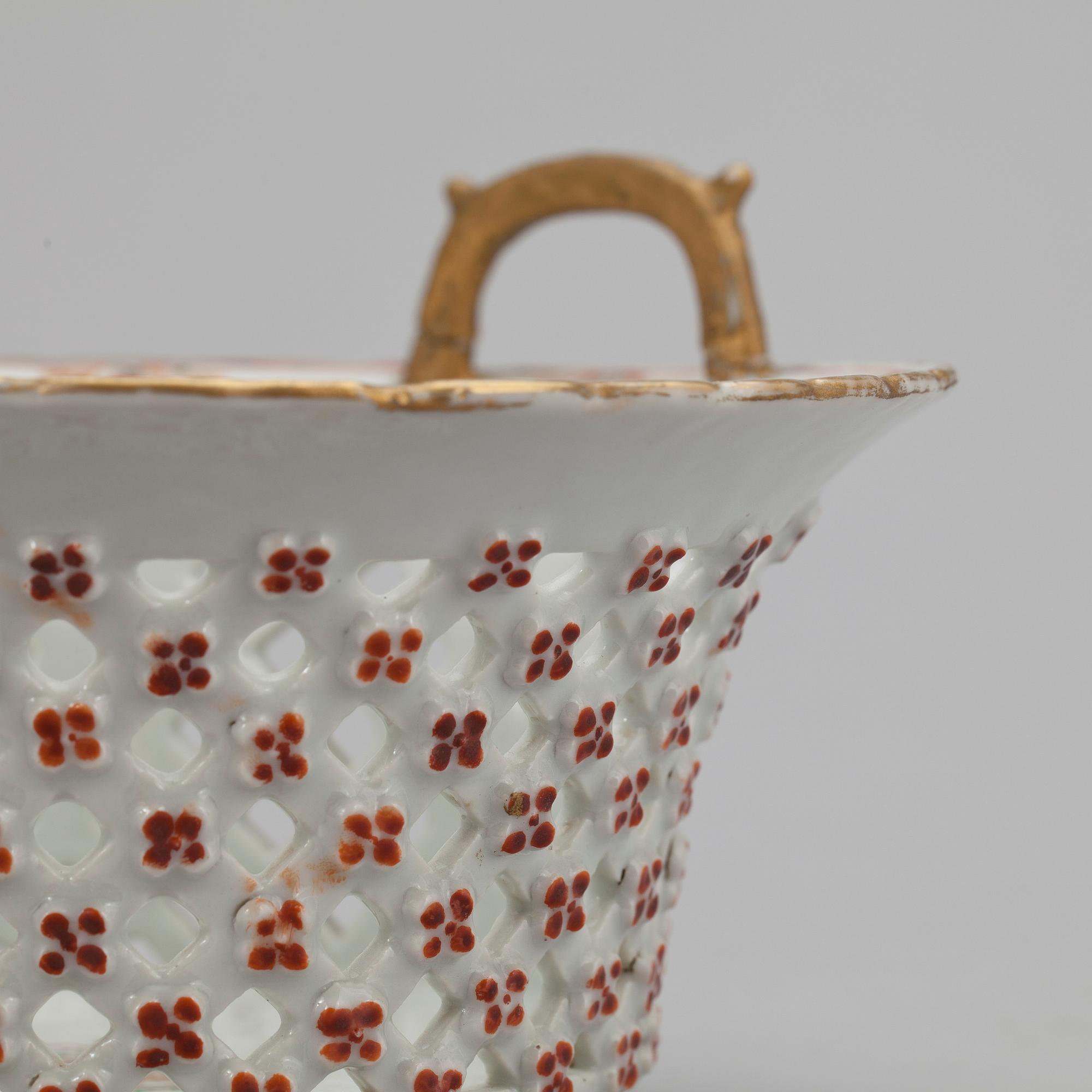 Blomsterdekor. Monogram i medaljong. Förgyllda hänklar samt förgylld rand. Diam 18-23, höjd 11 cm.