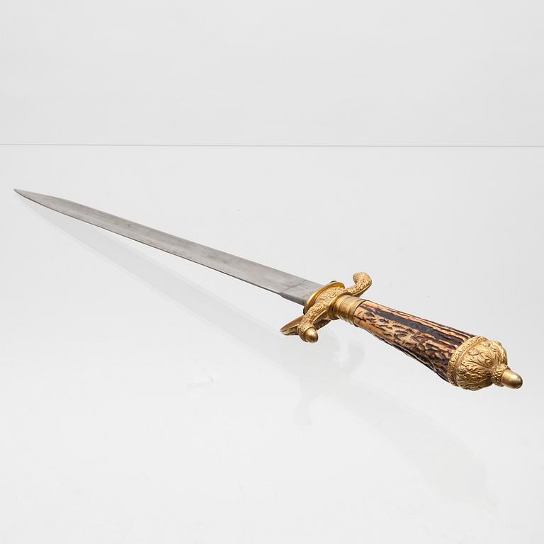 Förgyllda bronsbeslag med jaktmotiv. Hornkavel med dekor av ekollon. Klingans längd 37 cm. Totallängd inkl. balja 55 cm.