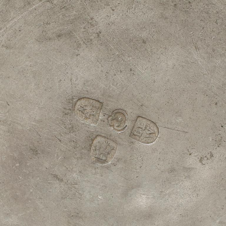 Två konande stop varav ett med otydlig tenngjutarstämpel från Stockholm, ett cylinderformat i barockstil med tre kulfötter, konande bägare på fotring, Henrik Philip Stickler, Helsingborg. Höjd 13-22,5 cm.