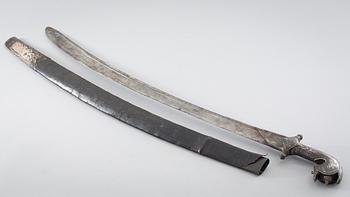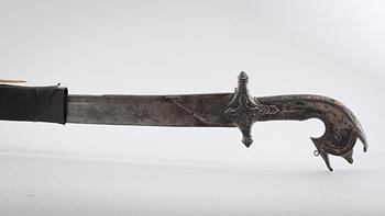 Krökformat hjalt i silver. Klinga, L ca 71 cm, med hjalt totallängd ca 86 cm. Balja, längd 75 cm.