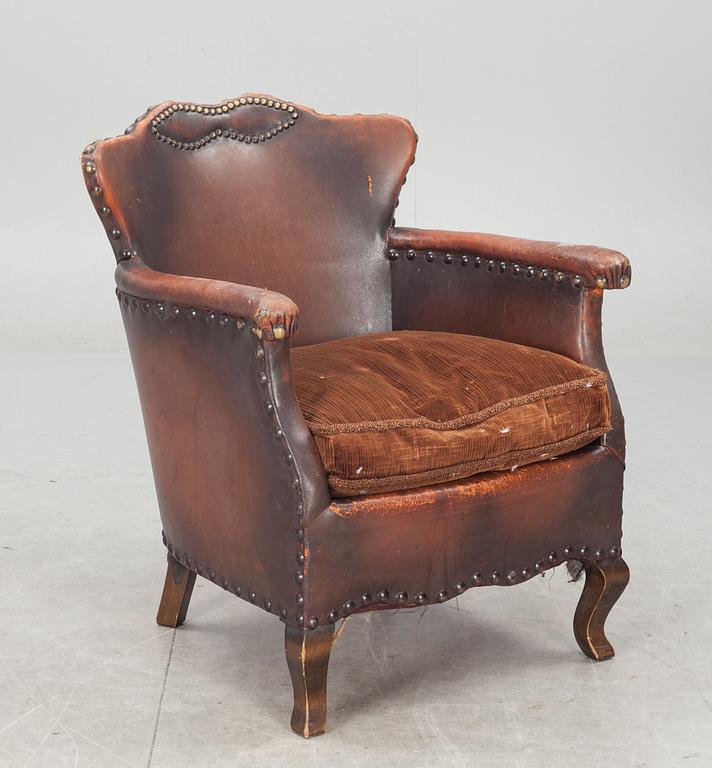 Klädd i brunt skinn med mässingsdetaljer. Lös sittdyna i brun plysch.