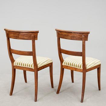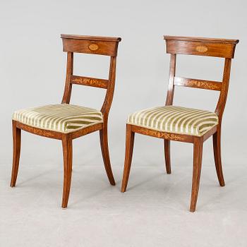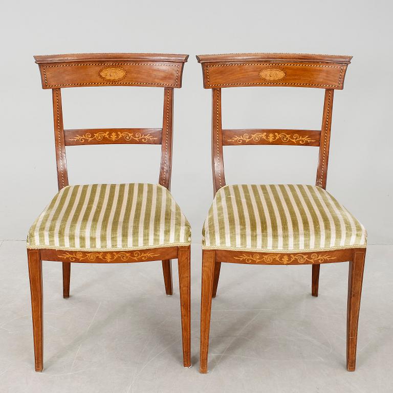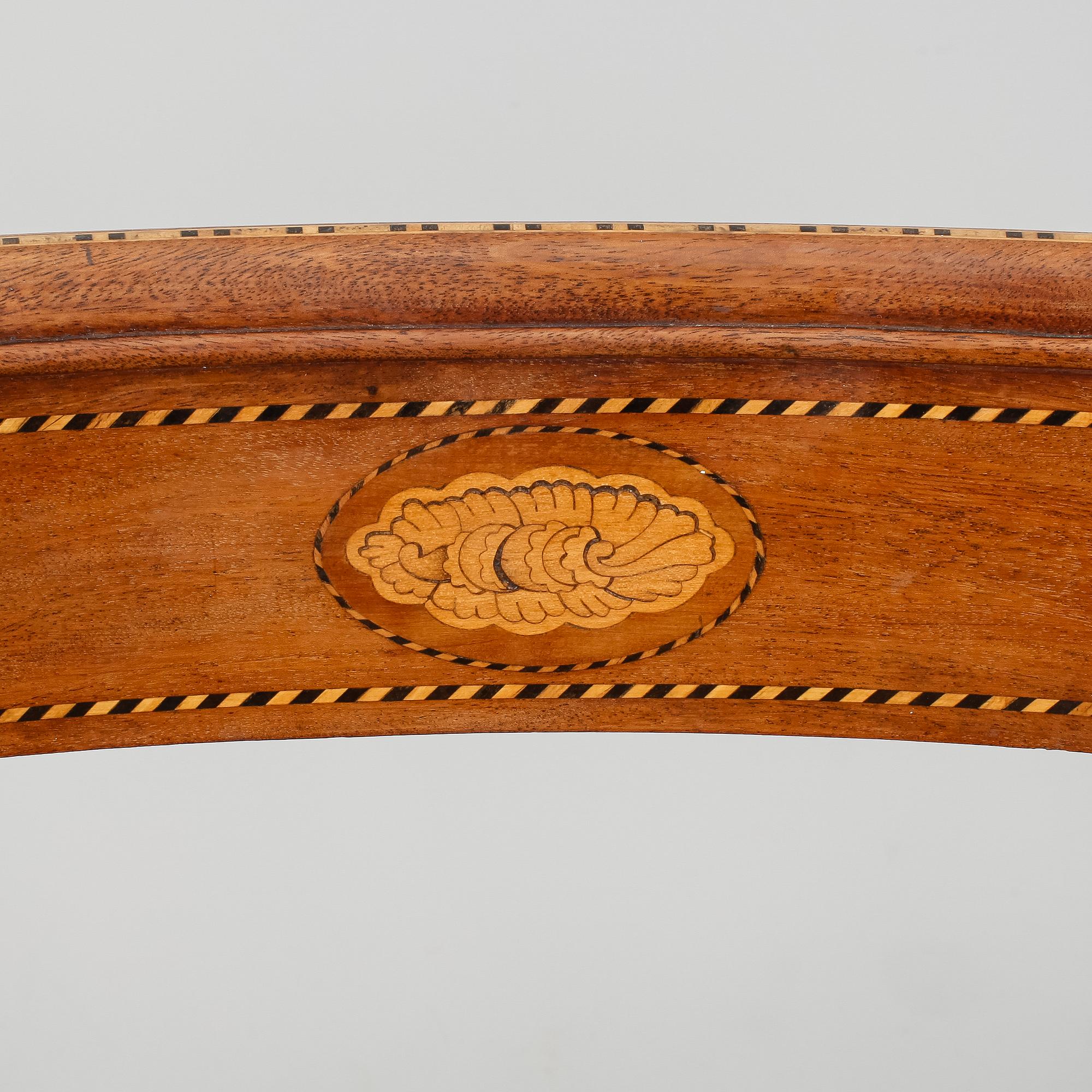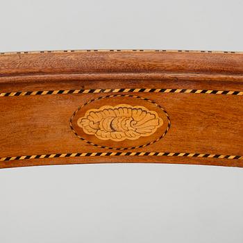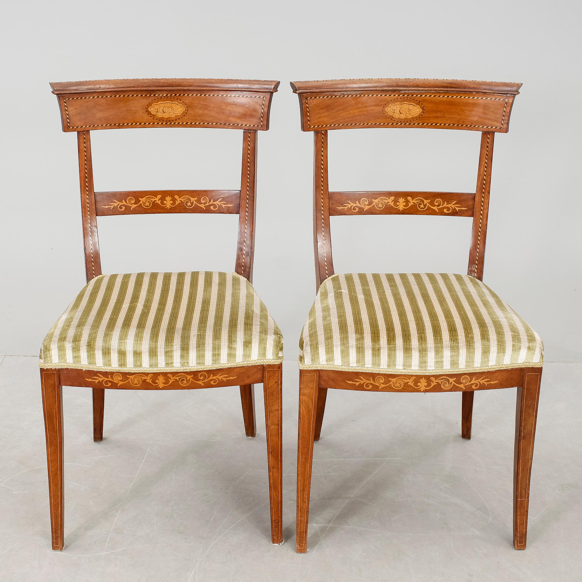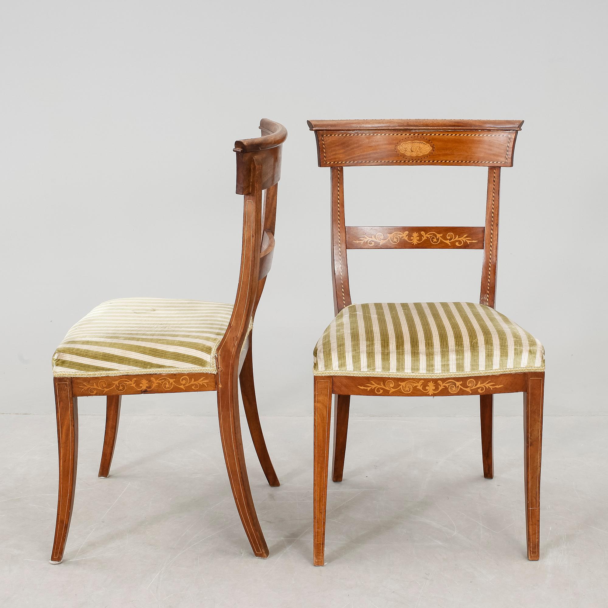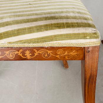 Mahogny, inläggningar, fast stoppad sits med randig sammetsklädsel, utåt svängda ben.