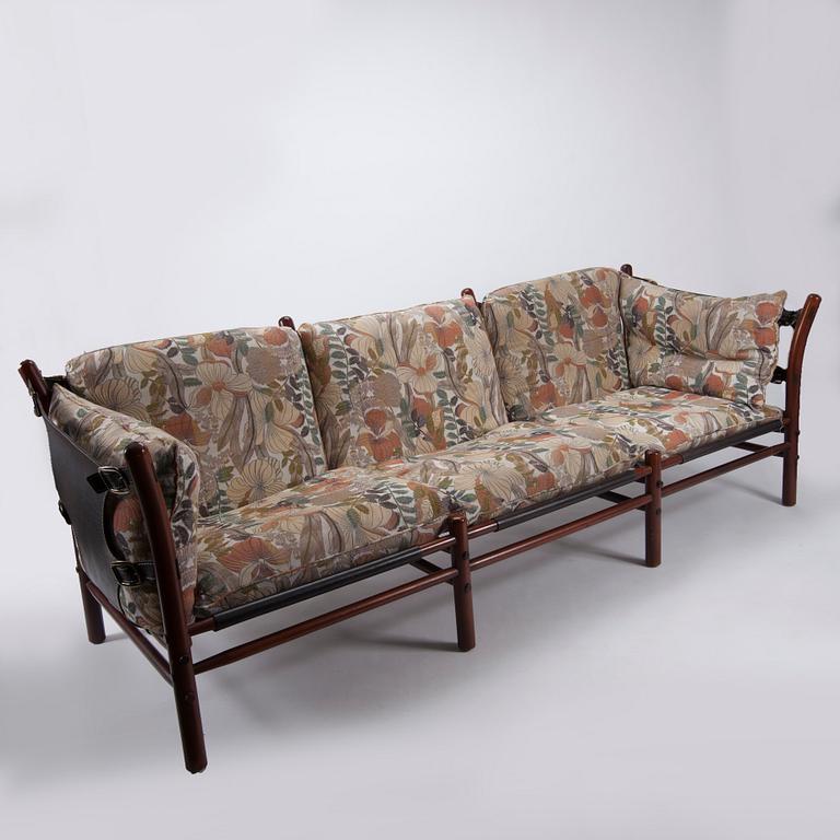 Tresitsig. Betsad trästomme, svart läder med metallspännen, plymåer med blommig klädsel. Längd ca 215 cm, djup 80 cm.