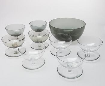 4 dessertskålar i klart och 4 i gråtonat glas, höjd ca 8,5 cm. Kaj Francks skål i grå glas, diameter 21,5 cm.