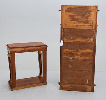 Fanerade i mahogny med bronsering. Konsolbord med dekor av egyptiserande byster samt lejontassar. Längd ca 70, bredd 37, höjd 81 cm. Spegel med rak form och tympanonkrön. Dekor av lagerkrans och bandrosett. Mått ca 153 x 70 cm.