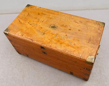 Angloindian. Beslag av mässing. Kulfötter. Längd 88. Bredd 45. Höjd 43 cm. Nyckel finns.