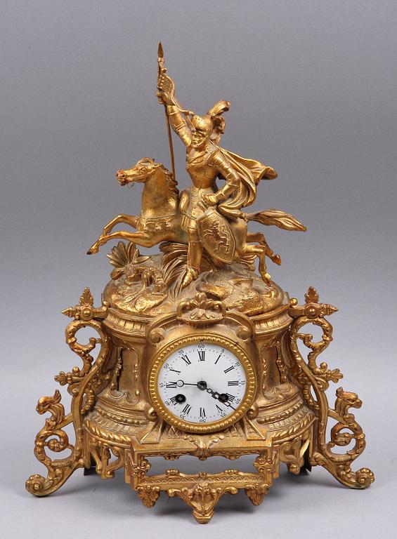 Bronserad. Märkt Brunfaut. Krönt med riddare i rustning till häst. Urtavla i emalj med romerska numeraler. Pendel finns. H 41. Nyckel finns.