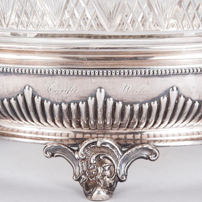 Skål på fyra voluterande fötter med blommor, driven dekor, pärlband och uppåtsvängda hänklar med bladmotiv. Insats i slipat glas med konturerad kant och stjärnslipad botten. Längd 42 cm, totalhöjd 16 cm.