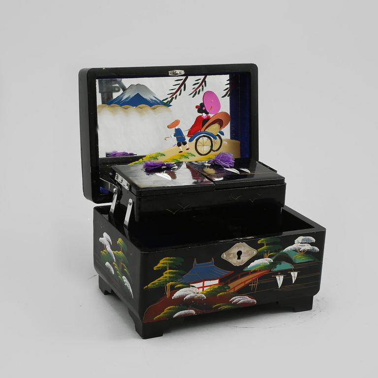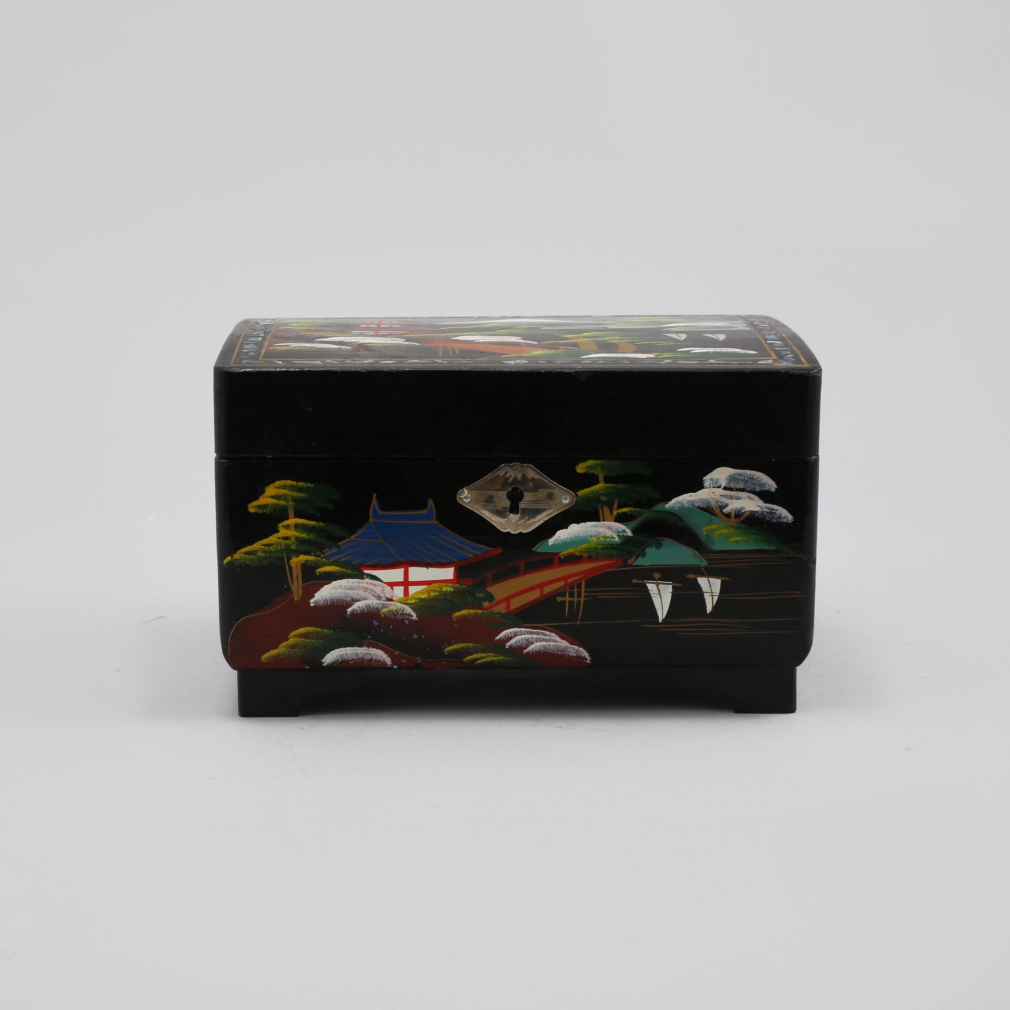 Dekor av landskap. Invändig lådinredning samt spegel med målad dekor. Längd 18, bredd 13, höjd 11 cm.