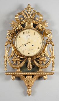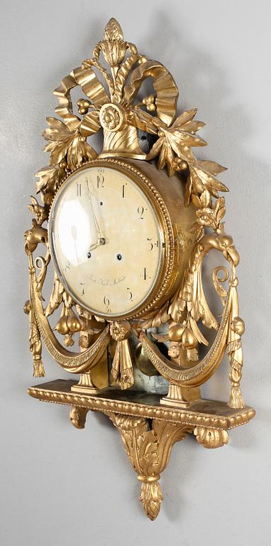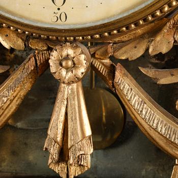 Förgylld och bronserad. Genombruten dekor av girlander, griphuvuden, blommor och bladverk. Nederdel med akantusblad och kotte. Krönt av bandrosett och lagerblad. Pendel finns. Höjd 95. Bredd 52 cm. Nyckel finns.