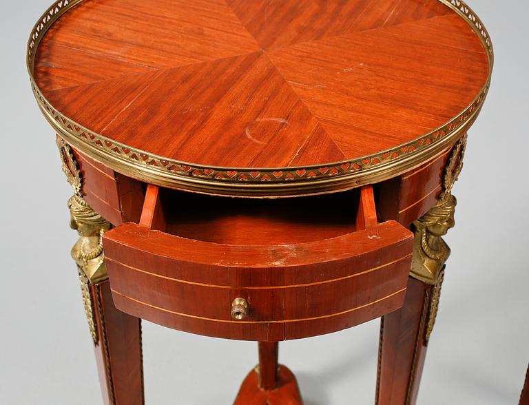 Fanerade i mahogny. Dekor i gulmetall. Skivor med upphöjd, genombruten kant. Tre kopplade ben samt en låda i sarg vardera. Diameter 48 cm, höjd 88 cm.