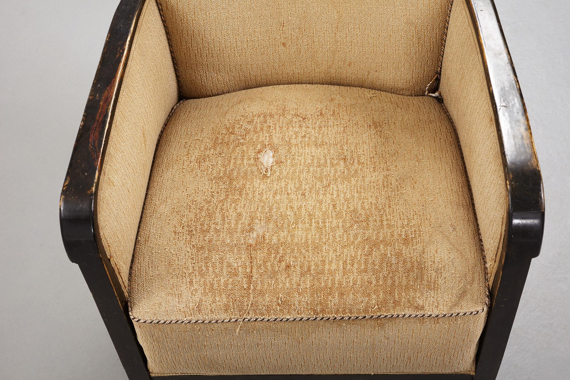 Klädsel med slitage och skador, renoverad stoppning. Stommar med bruksslitage. Ett armlän med smärre lagning.